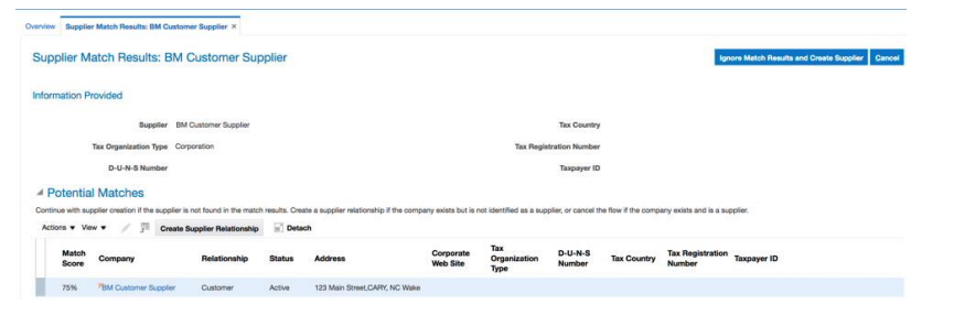 Screenshot below shows the popup window while creating a “Supplier Record” in Procurement cloud matched against a “Customer”record that was created in Sales/Engagement Cloud.