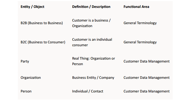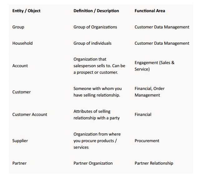 Each module within Oracle Fusion application cloud may use different terminologies for describing customers; but the underlying data model is same. Modeling of data need to be carefully thought through to avoid duplicates and to maintain clean, consistent, and complete version of data.