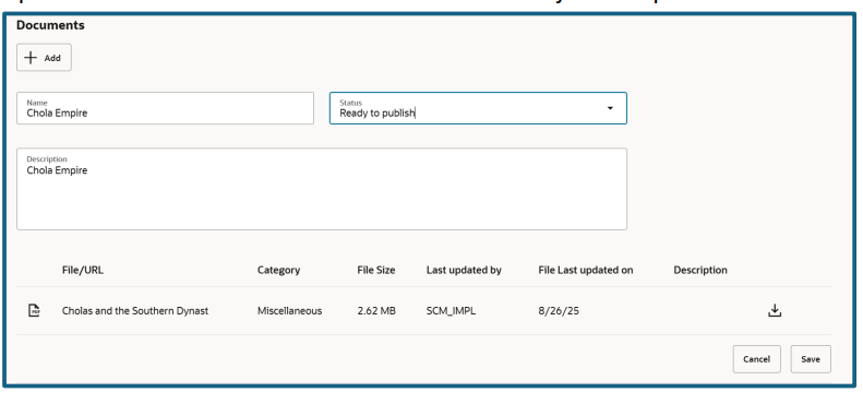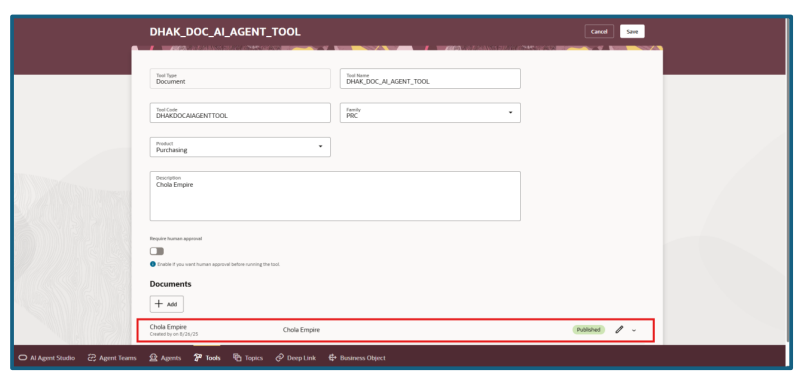 Upload any PDF document in Document Category. Status should be “Ready to Publish”. Click “Save” and execute the ESS process to publish the document for AI Agent.