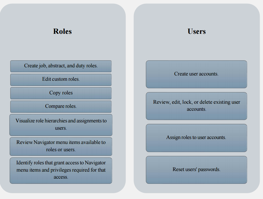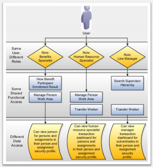 A user who fills multiple roles in the organization should be provisioned with multiple roles for security reasons so changesin responsibility can be quickly applied. The user’s functional and data accessis the union of grants provided by the provisioned roles. For example, a user can be provisioned with the Benefits Specialist, Human Resources Specialist, and Line Manager roles. These roles grant different, though partially overlapping, functional access, and differing data access