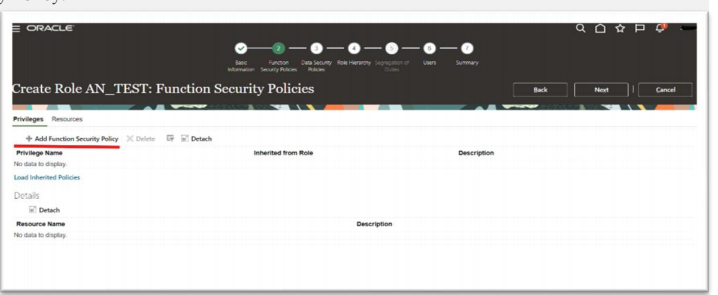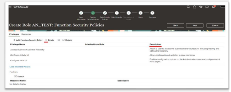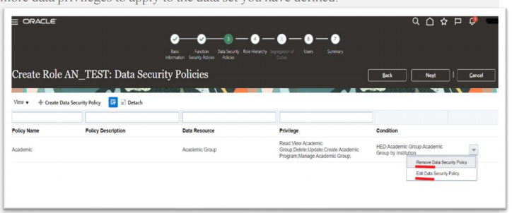 Modify, add, or remove function security policies. o Modify or remove data security policies provided by Oracle. o Modify the role hierarchy. The Predefined role check box is cleared if you’re editing a custom role or if you have copied a role. In
