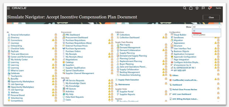 Identify roles that grant access to Navigator menu items and privileges required for that