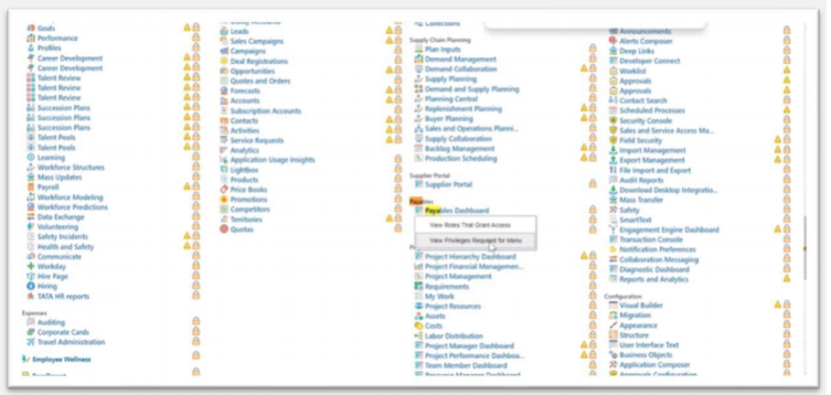 o View Roles That Grant Access: Lists roles that grant access to the menu item. o View Privileges Required for Menu: Lists privileges required for access to the menu item. Lists