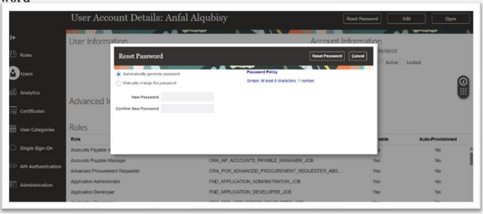 In the Reset Password dialog box, select whether to generate the password automatically or change it manually. For a manual change, enter a new password.