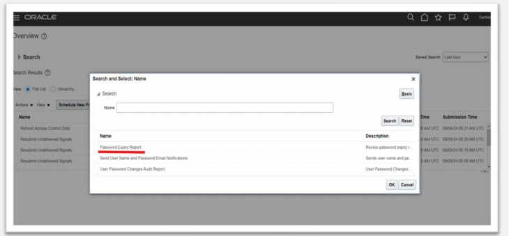In the Schedule Process dialog box,search for and select the Password Expiry Report process.