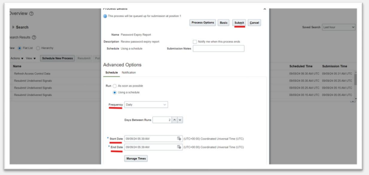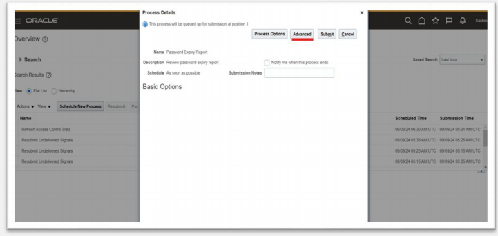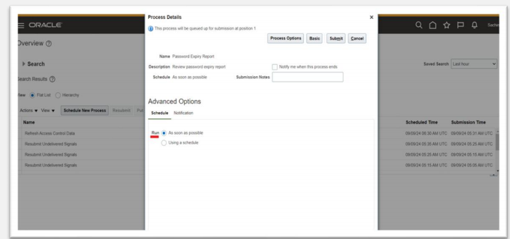 The Password Expiry Reportsendsthe password expiration warning and password expired notifications. You must schedule this report to run daily to help users know when their passwords have to be reset. In the Scheduled Processes work area, click Schedule New Process